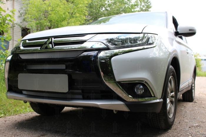 Защитная решетка радиатора Mitsubishi Outlander III (Митсубиси Аутлендер III рестайлинг) 2015 - верх, середина и низ (4 части) хром.