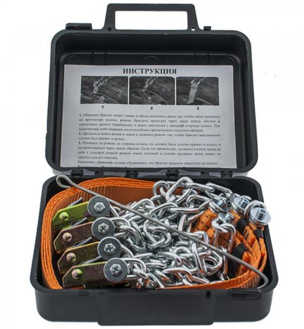 Браслеты на колеса эфективны при эксплуатации автомобиля по бездорожью, для преодолевания сложного участка дороги (снег, грязь, лед). Браслеты AUTOBRASLET-B предназначены для кроссоверов и внедорожников (передний, задний, полный привод), массой от 2000 кг. и размером колес от 205/65 до 310/90 с радиусом диска от R16 до R21.